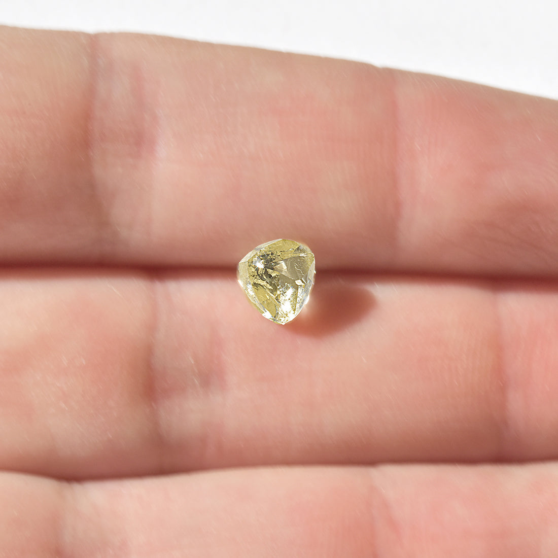 Description: Beautiful, sunny yellow raw diamond macle with trigons displaced on its surface. This raw diamond has a clean and clear heart, and is like a microcosm of a star, bright and shiny and sparkling with yellow light. It has smooth edges and clear, proportional lines. This is a really stunning raw diamond for any piece.