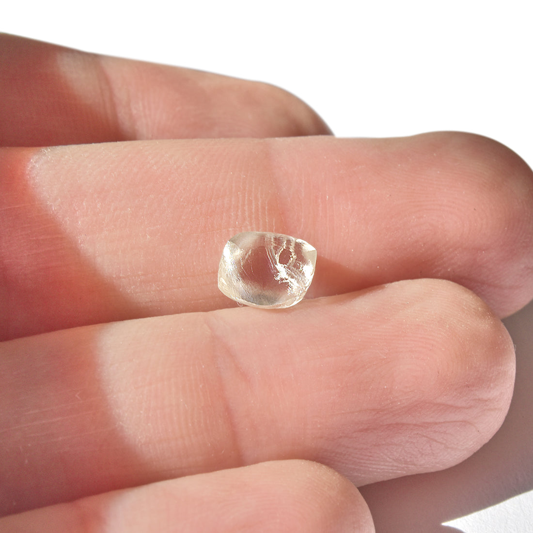 Description: Rounded rhombododecahedral raw diamond that has an open face and flat countenance to it. This piece has a very unique aspect to it, where in one side, the crystalline structure did not grow linearly, leaving a depression, almost like a glacial lake in the shape of a diamond, with growth lines reverberating out of it. From the other side of the stone, this depression in the stone appears as a bright glowing light internally. Either way that you look at this stone, it is unique and full of light, a beautiful, sizable piece.
